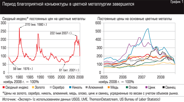 Настоящий спад в цветной металлургии начался нынешней весной: распродажи приобрели массовый характер, цены пошли вниз по всем позициям. Весной, летом и осенью падение шло практически без перерывов, постоянно ускоряясь. К началу ноября сводный индекс показал двукратное снижение по сравнению с ценовым плато 2007 года. Стоимость никеля по отношению к максимумам последних лет упала более чем в пять раз, цинка — в четыре с половиной раза, свинца — втрое, остальные металлы подешевели