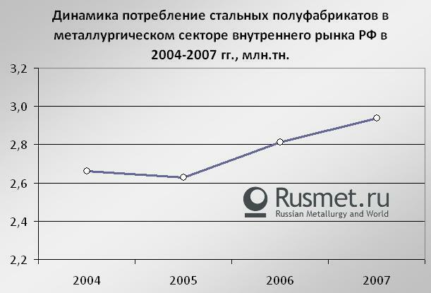 /© Rusmet.ru, Марк Сергеев/ В 2007 году на российском рынке полуфабрикатов продолжилась начавшаяся в 2006 году тенденция роста объемов потребления. Если в 2006 году емкость внутреннего рынка стали низких переделов выросла на 6-7%, то в прошлом году показатели роста составили около 5%. Суммарное потребление товарной заготовки, слябов и прочих полуфабрикатов на внутреннем рынке России по итогам 2007 года составило немногим менее 3 млн.т.