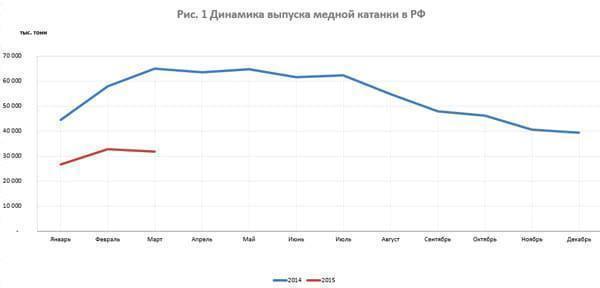 /Rusmet.ru, Инфомонитор/ По итогам марта 2015 года производство медной катанки по 6 крупным предприятиями в РФ снизилось на 51% к АППГ и на 3% к февралю 2015 года. По итогам 1 кв. 2015 года выпуск медной катанки снизился на 44,8% к 2014 году (рис.1)