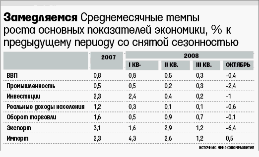 До конца года ситуация не улучшится, ожидает Минэкономразвития, прогнозируя снижение темпов экономического роста в IV квартале до 4,7% (9,5% в октябре — декабре 2007 г.).