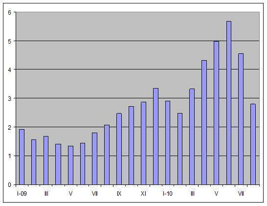 Что немаловажно, китайской продукции в продаже станет меньше. Во втором квартале избыточные поставки из Китая привели к переполнению регионального рынка и появления значительных складских излишков в Корее, Индии и Вьетнаме. Однако в августе китайский экспорт стали, более 80% которого в этом году отправляется в азиатские страны (считая Индийский субконтинент, но без учета Ближнего Востока), сократился до 2,80 млн. т – самого низкого показателя за полгода. Производство стали в стране в прошлом месяце составило 51,64 млн. т (в последний раз объем выплавки был меньшим в сентябре 2009 года), а в этом, очевидно, опустится до менее 48 млн. т.