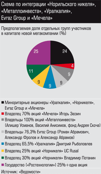Первая предполагает создание глобальной горно-металлургической компании (аналог австралийской ВНP Billiton) и предусматривает объединение активов «Норильского никеля», «Металлоинвеста» и, по всей видимости, ничего до тех пор не подозревавших о таком альянсе стальной корпорации Evraz Group, угольно-металлургического холдинга «Мечел» и производителя калийных удобрений компании «Уралкалий». Кроме того, архитектор мегакомпании Владимир Потанин предположил, что в компанию войдут металлургические активы госкорпорации «Ростехнологии» (в частности, «ВСМПО-Ависма» и заводы по производству спецсталей). Основной актив Олега Дерипаски UC Rusal не будет частью сделки «из-за слишком большого объема задолженности» (около 14 млрд долларов чистого долга). Согласно схеме государство сможет получить блок-пакет акций в новой компании (см.
